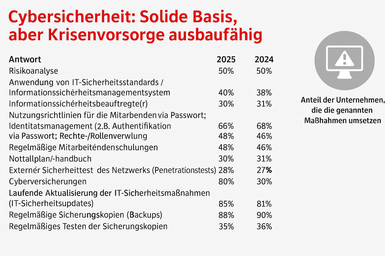 - Cybersicherheitslage bleibt sehr angespannt, trotz guter technischer Grundabsicherung. Krisenvorsorge ist mangelhaft.