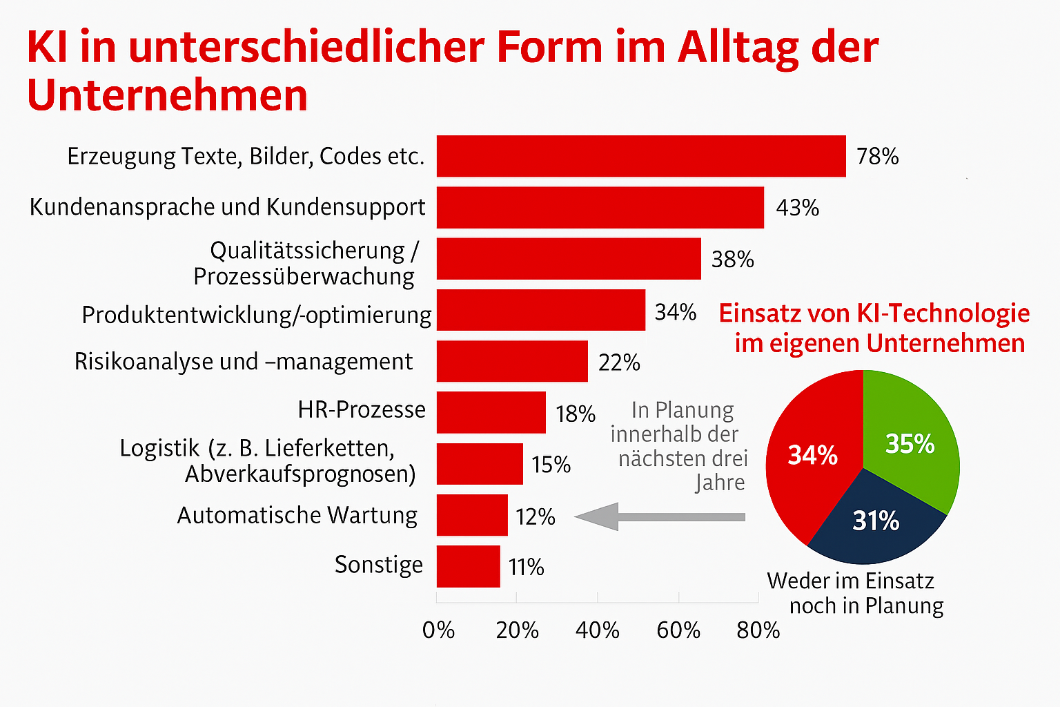 Die DIHK‑Ergebnisse zeigen, dass viele deutsche Unternehmen zunehmend das Potenzial von KI als Produktivitäts- und Wettbewerbsfaktor anerkennen: Etwa ein Drittel der Befragten Unternehmen (35 %) hat bereits KI-Technologien im Einsatz, ein weiteres Drittel (34 %) plant deren Einführung innerhalb der nächsten drei Jahre.