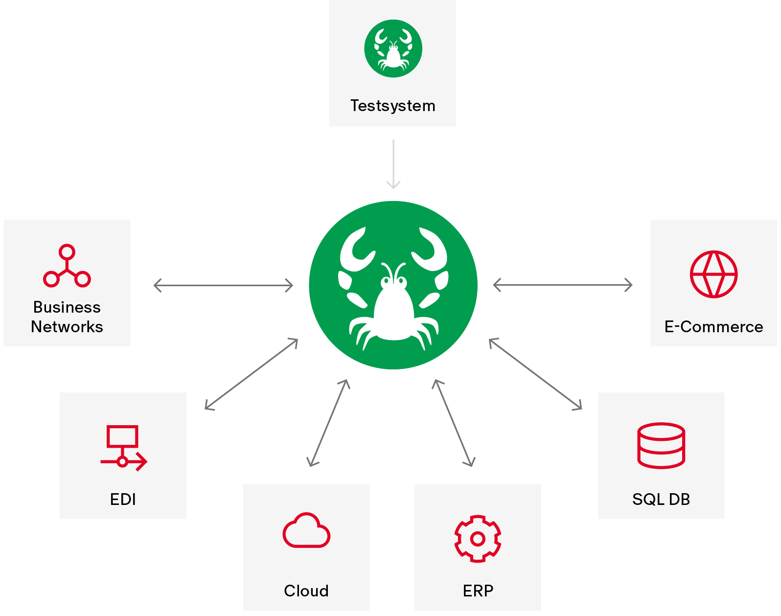 Schnelle, sichere Anbindung von Dritt- und Bestandssystemen durch breite Protokoll-, Schnittstellen- und Formatunterstützung: REST/GraphQL, SOAP, SFTP/FTPS, MQTT, JDBC/ODBC, JSON, XML, CSV sowie EDI-Standards (EDIFACT, ANSI X12)